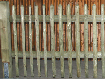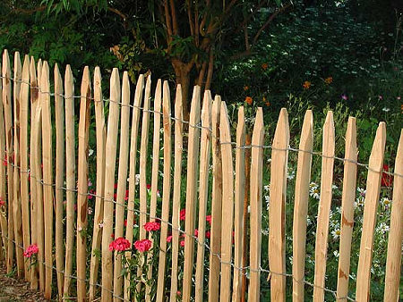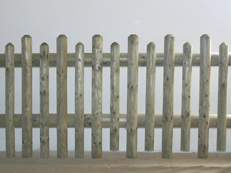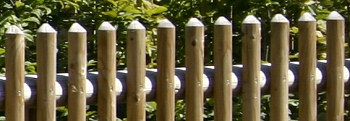 Staketenzaun aus halbrund sauber gefrästen Zaunlatten, Spitzen oben stumpf gekegelt. |